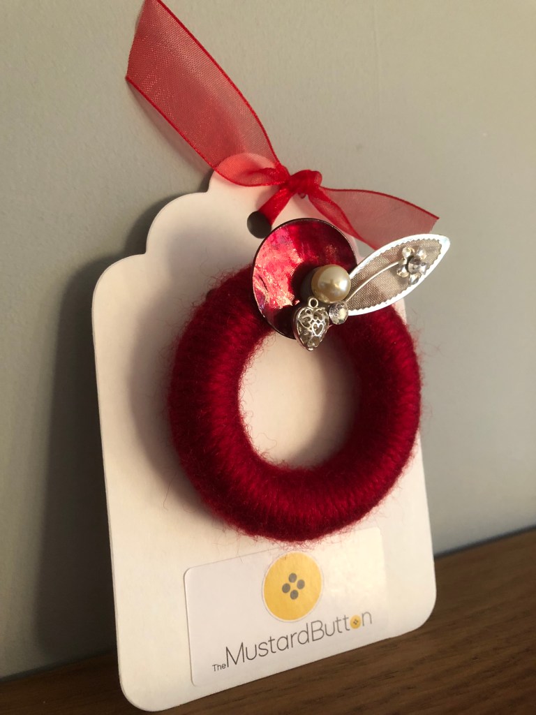Wool wrapped curtain rings embellished with jewellery and buttons. Unique and unusual.
